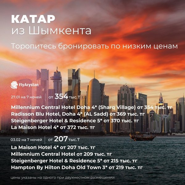 АКЦИОННЫЙ ТУР В КАТАР НА SINGLE за 385 ТЫС ТГ Вылет из Шымкента 27.01 на 7 ночей Проживание в La Maison Hotel/ BB ПОСЛЕДНЕЕ МЕСТО НА РЕЙСЕ *Цена нетто Наши контакты: ул.Торайгырова 113 оф.6 гостиница «Алтын-Отау» 4 этаж за ресепшн WhatsApp