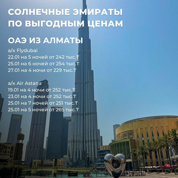 Солнечные Эмираты по выгодным ценам ОАЭ из Алматы а/к Flydubai 22.01 на 5 ночей от 242 тыс.тг 25.01 на 6 ночей от 254 тыс.тг 27.01 на 4 ночи от 229 тыс.тг а/к Air Astana 19.01 на 4 ночи от 252 тыс.тг 23.01 на 4 ночи от 252 тыс.тг 25.01 на 7 ночей от 251 тыс.тг 25.01 на 5 ночей от 265 тыс.т Наши контакты: ул.Торайгырова 113 оф.6 гостиница «Алтын-Отау» 4 этаж за ресепшн WhatsApp