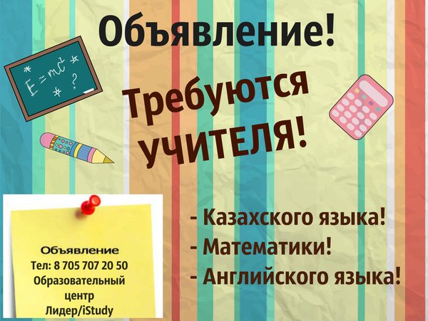Луиза Толеген (12.09.2016): Объявление!!! Требуются УЧИТЕЛЯ активные живые и комуникабельные! — Казахского языка — Математики — Английского языка Обращаться по телефону Ержан или писать в л/с
