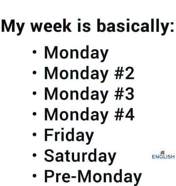 Мы знаем с вами только основные дни недели, но также в английском языке существуют и другие очень ИНТЕРЕСНЫЕ и СТРАННЫЕ дни! Давайте разбираться! *** Blue Monday — тяжелый понедельник (первый рабочий день после воскресенья) Monday feeling — нежелание работать (после воскресенья) Bloody Monday — студ. первый день каникул, день наказания нарушителей Black Monday — 1) школ. разг. первый день после каникул; 2) церк. понедельник на Фоминой неделе Handsel Monday — первый понедельник года Fat Monday — последний понедельник перед Великим постом (… — Читать дальше