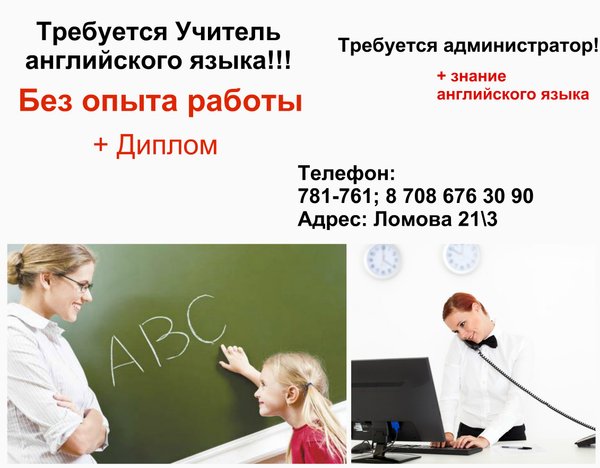Луиза Толеген (16.03.2016): ВНИМАНИЕ ВНИМАНИЕ! Требуется Учитель английского языка! Основные требования: молодой специалист без опыта работа. Также, иметь диплом об окончании университета или колледжа! Требуется администратор! Основные требования: коммуникабельность, ответственность и знание английского языка (желательно)! Обращаться в л/с Телефон 781—761; Адрес: Ломова 21/3 Языковая школа «iStudy»