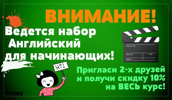 Луиза Толеген (17.10.2015): ВНИМАНИЕ! Мы объявляем набор: крус Английский для начинающих 27 000 тенге за 3 ГОДА! Взрослые и детские группы! Также, Вы можете пригласить 2-х своих друзей или знакомых, и получить скидку 10% на ВЕСЬ курс! Не упусти такой шанс! Мы ждем тебя! ---------------------------------------------------------------------- адрес Ломова 21, 3 этаж, 5—6 кабинет, НАПРАВО! Подписывайтесь и задавайте свои вопросики в Нашей группе!