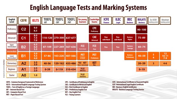 курсы, соответствует всего лишь среднему уровню по шкале ALTE. Сразу оговоримся, что не стоит расстраиваться, уважаемые изучающие английский язык, так как все организации и учебные заведения, работающие с людьми, для которых английский язык не родной, знакомы с нижеприведенной шкалой и знают об этих различиях в уровнях. А если вы собираетесь учиться в ВУЗе англоязычной страны или устроиться на престижную работу, напрямую связанную с применением языковых знаний, то об уровне языка вас там особо и спрашивать не будут — им нужны будут результаты TOEFL, IELTS и т.д. Все эти экзамены имеют свою градацию и соответствуют последним уровням по шкале ALTE. В случае подготовки к TOEFL или IELTS речь, как правило, идет о сдаче экзамена на определенный балл. Курсы подготовки к кембриджским экзаменам - FCE, CAE, CPE — длятся не менее учебного года каждый, при этом подразумевается, что каждый из этих уровней выводит вас на качественно новую ступеньку владения языком. Certificate of Proficiency in English (CPE) — документ, подтвердающий то, что вы владеете английским языком почти так же свободно, как и родным. Последний уровень, которого можно достичь — Post-Proficiency. Он описывает людей, которые знают английский язык практически в совершенстве, на уровне образованного носителя языка. На этом уровне при общении на английском языке могут возникнуть трудности только культурного плана: например, смысл шутки может ускользнуть, если она обыгрывает цитату из какой-нибудь телепередачи, фильма или книги. Студент уровня Post-Proficiency чрезвычайно редко ошибается, используя английский язык, но при этом много практикуется, чтобы не потерять навыки. Далее градации уровней уже нет, вас просто назовут «native English speaker». » Уровни английского языка: Ниже приводится описание уровней владения английским языком в соответствии с рекомендациями British Council: Beginner Elementary Pre Intermediate Intermediate Upper Intermediate Advanced Уровень Beginner Беседа произносить свое имя и личные данные отвечать на элементарные вопросы (как тебя зовут, сколько тебе лет и т.п.) считать до ста Понимание Знать алфавит и уметь произносить по буквам слова Понимать элементарные предложения и вопросы Уровень Elementary Беседа Узнавать и предоставлять краткую информацию о себе и других Узнавать и предоставлять краткую информацию не личного характера Выразить свои мысли так, чтобы Вас поняли и попросить прояснить ту или иную ситуацию, чтобы Вам стало ясно, о чём идёт речь Выражать простые идеи и чувства Говорить с произношением, которое будет всем понятно Пользоваться языком для общения и разрешения проблем в любой англоговорящей стране Понимание Улавливать основной смысл аудирования на уроке Понимать основные ключевые моменты аудирования Читать короткие тексты и улавливать основные идеи. Письмо Правильно составлять предложения Написать открытку, e — mail, небольшой запрос или уведомление Составить краткую характеристику о себе Грамотно начать телефонный разговор Уровень Pre Intermediate Беседа Говорить с чётким произношением Предоставлять информацию личного и отвлечённого характера Ясно объяснить, что Вы чего-то не понимаете Понять объяснение тех или иных вопросов в ситуации недопонимания Чётко выражать свои мысли и чувства Оперировать основными ситуациями общения Понимание Понимать основную идею текста Чётко различать ударение, звуки и интонацию Читать несложные тек
