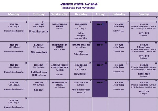 Луиза Толеген (06.11.2015): Разивавайте Английский вместе с Американ корнер!#American Corner Pavlodar is cool! Там вы можете найти много полезной литературы! И Небольшая просьба ребята, если вы придете на мероприятие, сказать Аселе или Алине что вы от iStudy или от Саши! --- Частная группа (05.11.2015): Dear friends! Here is an November Schedule of the AC. Please feel free to call or email us, if you have any further questions.