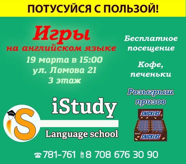 !!!Гарантируем результат!!! Запишись на курсы английского языка до 10.07.2016 и получи БЕСПЛАТНО НОУТБУК, ПЛАНШЕТ или СМАРТФОН.* Торопитесь, Сроки ограничены!!! ● Английский язык с ГАРАНТИЕЙ РЕЗУЛЬТАТА. Если Вы не заговорите через 3 месяца, мы ВЕРНЕМ ВАМ ДЕНЬГИ. ● 3 года обучения ВСЕГО ЛИШЬ за 27 000 тенге! Вы можете оплатить в рассрочку. *Стань нашим клиентом и участвуй в розыгрыше ценных призов. Правила конкурса смотрите по этой ссылке Да, да! И это все у нас, в Языковом центре IStudy Подробности по телефону 781 761 What's up