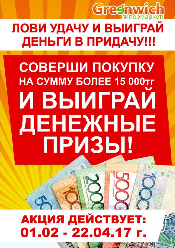 Лови удачу и получи деньги в придачу! Гипермаркет Гринвич снова дает возможность выиграть огромное количество призов! Купи любой товар в гипермаркете Гринвич и участвуй в мега розыгрыше! Подробности на сайте и по телефону 903 - 066.