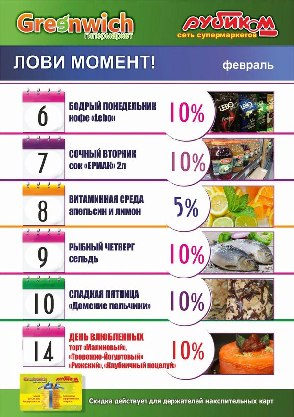 ЛОВИ МОМЕНТ! Предложение только для держателей накопительных карт!!! Скидки действует в гипермаркете «Greenwich» и сети супермаркетов «Рубиком»!!! Следите за новостями!!!