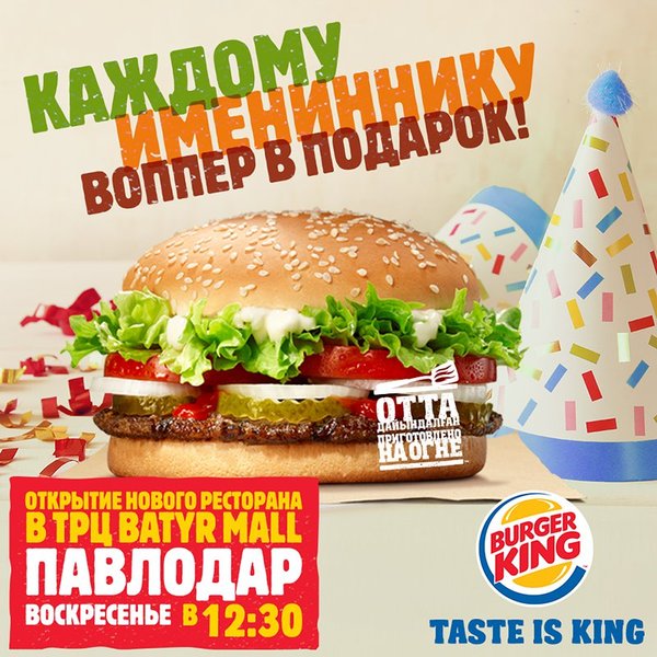 Та-дааам! Дорогие жители и гости города Павлодар! В это воскресенье 1 октября в 12:30 состоится торжественное открытие нового ресторана Burger King в ТРЦ Batyr Mall! Здесь Вы всегда сможете насладиться свежайшими бургерами, нежнейшими наггетсами и неповторимыми соусами. Ну и какой же День Рождения без подарков? Каждому имениннику в этот день с радостью подарят легендарный Воппер, приготовленный на открытом огне! Чтобы получить подарок нужно просто показать документ, подтверждающий дату рождения. ------------------------------------------ Ждем В… — Читать дальше