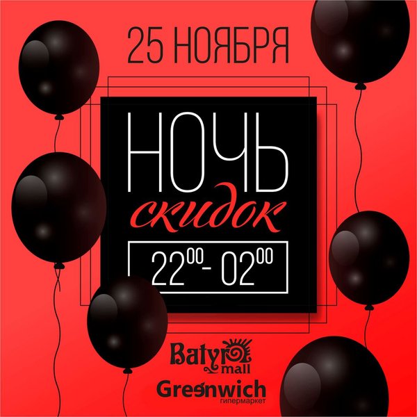 Друзья! ТРЦ Batyr Mall совместно с гипермаркетом Greenwich проводит грандиозную ночь скидок 25 ноября с 22:00 до 02:00!