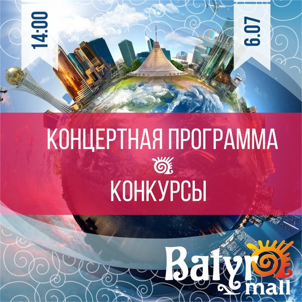 Добрый день, друзья! Желаем всем провести это воскресенье с пользой! Ну а пока анонсируем концерт, посвященный Дню Астаны, который состоится в нашем торгово-развлекательном центре 6 июля! Приглашаем всех желающих!