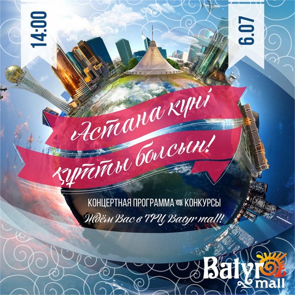 Поздравляем всех казахстанцев с Днём Астаны! С днём рождения, любимая столица! Расти большой и красивой! ️ Друзья, приглашаем вас на праздничный концерт, который состоится в нашем торгово-развлекательном центре в 14.00, не пропустите!