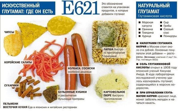 многие другие биологически активные вещества, имеющих белковую структуру: рецепторов, гормонов, ферментов. Кроме того, эти аминокислоты сами по себе – биологически активные вещества. Глутаминовая кислота и глутамин – нейромедиаторы. Это вещества, благодаря которым происходит передача нервного импульса от одной нервной клетки к другой. Глутаминовая кислота представляет собой и слабое ноотропное средство, улучшающее работу головного мозга. Глутамин в организме может превращаться в глутаминовую кислоту. Пятый вкус Поскольку глутамат натрия – хорошо растворимая соль, в воде он существует в виде двух ионов: иона натрия и иона глутамата. Ион глутамата увеличивает чувствительность вкусовых рецепторов языка и вызывает ощущения особого, «мясного» вкуса. Поскольку различают четыре основных вкуса: кислый, сладкий, горький и соленый – в Японии его называют «пятым вкусом» — умами. Именно из-за этого свойства глутаминовую кислоту и ее соли (глутаматы натрия и другие) используют в качестве пищевой добавки – усилителя вкуса. Их обозначения: E 620 (глутаминовая кислота), Е 621 (глутамат натрия), Е 622–625 (глутаматы калия, кальция, магния и аммония). Чаще всего используют глутамат натрия. В очень многих пищевых продуктах (в первую очередь, «мясных» супах быстрого приготовления и колбасных изделиях) можно найти на упаковке Е 621. Реальный вред В силу того, что глутамат усиливает вкус любой пищи и делает его крайне насыщенным, человек постепенно привыкает к такой «яркой» пище. Постепенно продукты без глутамата начинают казаться пресными и безвкусными, а к еде с «пятым вкусом» возникает привыкание. В результате ее потребление возрастает. Поскольку глутамат активно используется производителями фаст-фуда и «быстрой еды», в погоне за специфическим вкусом человек переходит на несбалансированное питание с избытком калорий и быстро набирает лишний вес. Так, согласно исследованию, проведенному в Китае, потребление еды, богатой глутаматом натрия, действительно, увеличивает шансы набрать избыточный вес. Чтобы не переборщить с глутаматом натрия и родственными пищевыми добавками, стоит соблюдать несколько простых правил: — По возможности избегайте фаст-фуда: в котлеты и сосиски усилители вкуса добавляют очень часто, — Готовьте дома из купленных на рынке или в супермаркете сырых продуктов, — Не пользуйтесь смесями приправ и добавками «для супа», «для вторых блюд», покупайте чистые несмешанные приправы, — Внимательно читайте на этикетках состав упакованных мясных и колбасных продуктов. Если встретите там E 620, E 621, E 622, E 623, E 624 или E625 – в продукте есть глутамат. Что нужно знать? Глутаминовая кислота и глутамин – важнейшие вещества для функционирования организма человека. Глутамат натрия – безопасная пищевая добавка сама по себе, однако злоупотребление ею может привести к набору лишнего веса..