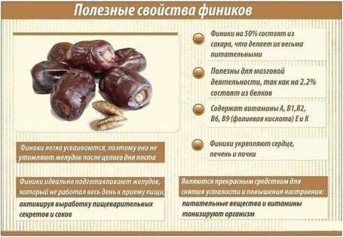 – это в основном фруктоза и глюкоза, которые полностью безопасны для организма и делают финики сродни мёду. В связи с тем, что финики малокалорийны и содержат огромное количество полезных веществ, их рекомендуют употреблять вместо сладостей для всех, кто придерживается диеты, либо старается просто поддерживать свой вес в норме. Считается, что сушеные финики благоприятно воздействуют на мозг, увеличивая его производительность на 20% и более. Со стародавних времен финики были известны своими целебными свойствами. Считалось, что плоды финиковых пальм дают силу, выносливость, увеличивают продолжительность жизни, усиливают мужскую половую потенцию. Они укрепляют сердце, печень и почки, способствуют развитию в кишечнике полезных бактерий, поддерживают кислотный баланс организма и питают кровь, способствуют развитию корневых окончаний мозга, усиливают способность организма противостоять различным инфекциям, в том числе вирусным. Финики полезны также при анемии и гипертонии, для груди и легких, успокаивают кашель и способствуют выводу мокрот, чрезвычайно полезны для мозговой деятельности. Пищевые волокна, содержащиеся в финиках, снижают риск раковых заболеваний. Из-за высокого содержания калия врачи рекомендуют употреблять финики при сердечно-сосудистых заболеваниях. При сердечной недостаточности финики стимулируют деятельность сердца, служат тонизирующим и укрепляющим средством, восстанавливают силы после продолжительной болезни. Помогают финики при переутомлении и физической усталости, при сахарном диабете. Отвар фиников с рисом помогает при дистрофии. Особенно полезны финики женщинам при беременности и при кормлении ребенка. Они облегчают роды, способствуют началу выработки женским организмом молока.