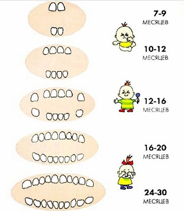 Добрый день. А вот и таблица для родителей, которых интересует время и последовательность прорезывания молочных зубов. Как вы сами понимаете, в жизни эти процессы могут быть немного другими, от 6 месяцев до 1 года, так что сохраняйте спокойствие и ждите. Приучайте деток к гигиене полости рта с раннего возраста и посещайте регулярно детского стоматолога, знайте лучше предотвратить зубную боль, чем проводить бессоные ночи у кроватки вашего малыша