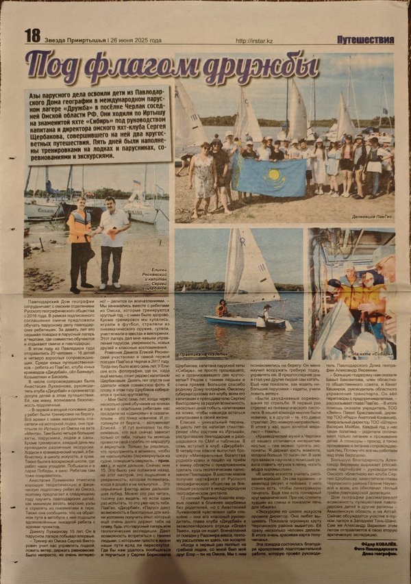 Публикация журналиста Фёдора Ковалёва в Павлодарской областной газете «Звезда Прииртышья» об участии детей ПавГео в Международном парусном лагере в посёлке Черлак Омской области России.