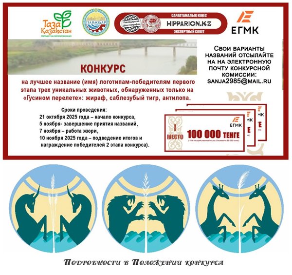 Внимание!!! Конкурс на лучшее название (имя) логотипам-победителям первого этапа трёх уникальных животных, обнаруженных только на «Гусином перелёте»: жирафа, саблезубого тигра и антилопы.
