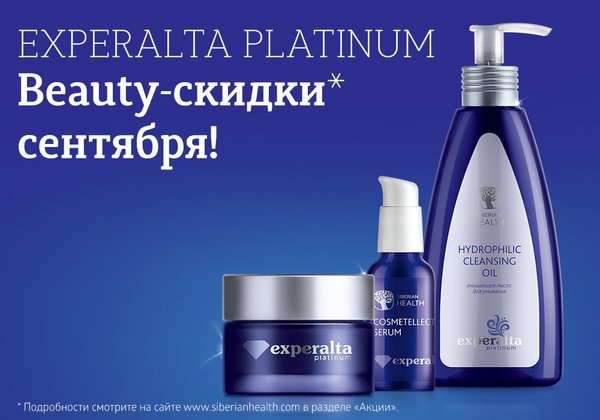 покупке на сумму от 3500 руб. Experalta Platinum «Интеллектуальный крем». Он заметно устраняет все виды морщин: горизонтальные, вертикальные, «гусиные лапки» вокруг глаз, кисетные морщины вокруг рта. Именно в сентябре при покупке на сумму от 3500 руб. у тебя есть шанс приобрести и этот премиальный продукт за половину его цены. Experalta Platinum «Очищающее масло для умывания». Только с гидрофильным маслом можно удалить практически любое загрязнение, декоративную косметику, водостойкую тушь и даже театральный грим без пересушивания и ощущения стянутости на коже. В сентябре «Очищающее масло» + «Увлажняющий тонирующий крем» стоят всего 1100 руб. – специальная цена за два продукта вместе! Сделаешь запас одного любимого премиального продукта? Или приобретешь понемногу всех средств для молодости кожи твоей любимой серии? Делись в комментариях, заказывай на. Особый продукт, особое предложение!