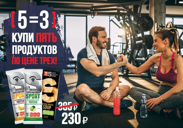 Только в августе участвуй в самой спортивной акции этого месяца и купи сразу пять продуктов для твоих достижений по цене трех: три мультикомпонентных протеина (банан, ваниль, яблоко), один протеиновый суп с пармезаном и комплекс ВСАА с лимоном. С таким набором твои тренировки станут продуктивнее и уж точно вкуснее! Да и кто сказал, что нужно останавливаться на одном наборе? Заказывай сколько нужно по ссылке: