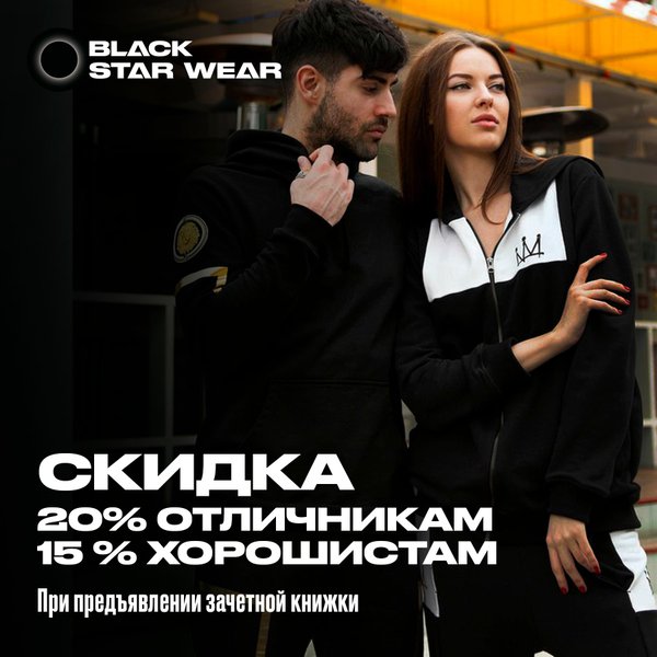 Если в этом году ты учился без троек, тебе к нам! В Магазине Black Star Wear скидки для студентов\школьников! 20% отличникам! 15% хорошистам ВНИМАНИЕ! При себе иметь зачетку\дневник