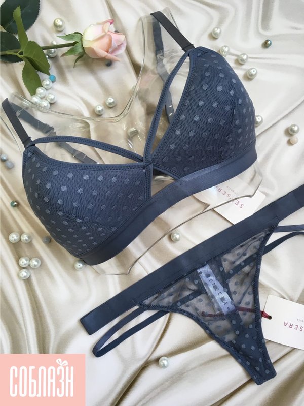 SENSERA. Оригинальный бюстгальтер с мягкой треугольной чашкой из сшитого поролона без каркасов. Выполнен из серой эластичной сетки в горошек. Эластичная лента под лифом и боковые корсетные вставки улучшают посадку. Треугольный вырез и эластичные ленты дополняют игривый образ. Размеры: 70ABC, 75ABC, 80BC Цена бюстгальтера 7600 kzt. Стринги 3300 kzt. Артур 2, бутик 230 «Соблазн», этаж 1