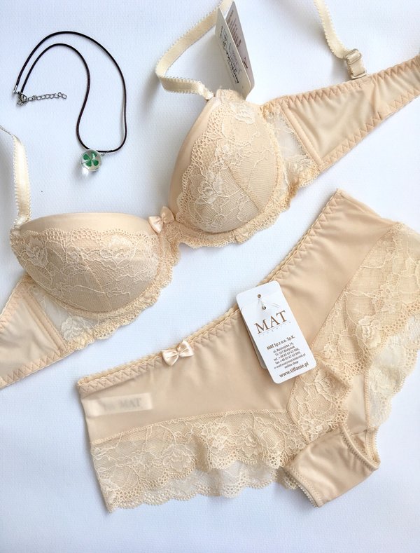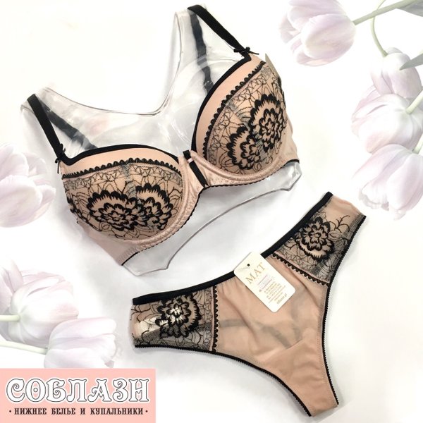 MAT — нижнее белье польского производителя. Красивый комплект нижнего белья с чашкой пуш-ап. Выполнен в бежевом цвете, декорирован кружевным полотном. Вставки съемные, бретельки регулируемые. Низ на выбор – стринги либо слипы. Цена бюстгальтера 11300, трусики 6000, стринги 5400. Размеры: 65DEF, 70BCDEF, 75EF Артур 5, бутик 139 «Соблазн», этаж 1