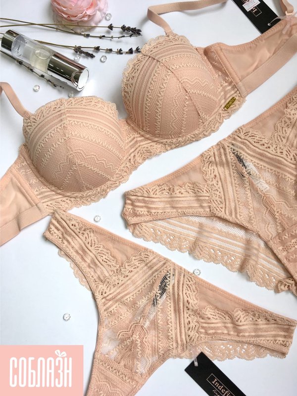 Комплект indefini. Стильный, красивый комплект, бюстгальтер с тонкой поролоновой подкладкой. В комплект входят бюстгальтер и двое трусиков, стринги и слипы. Состав: 90% полиамид 10% эластан Размеры: 75ВС, 80С Цена комплекта 10300 kzt. Артур 2, бутик 230 «Соблазн», этаж 1