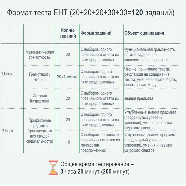русских школ и русский — для школ с казахским, уйгурским, узбекским и таджикским языками обучения). Предмет по выбору также будет сдаваться тестированием — физика, химия, биология, география, геометрия, всемирная история, литература или иностранный язык», — рассказала в ходе брифинга СЦК директор Департамента дошкольного и среднего образования МОН РК Жаныл Жонтаева. По словам директора Департамента высшего и послевузовского образования МОН РК Дархана Ахмед-Заки, новый формат сдачи ЕНТ для поступающих в вузы предполагает три обязательных предмета: математическую грамотность, грамотность чтения и историю Казахстана, экзамен по которым будет содержать по 20 вопросов, а также два профильных предмета по 30 вопросов. К слову, при 120 вопросах максимальное количество баллов составило 140. Это объясняется тем, что некоторые вопросы в профильных предметах будут иметь несколько правильных вариантов ответа. Общее время тестирования составит 210 минут. Несмотря на увеличение количества вопросов, МОН РК оставил проходной балл на уровне 50. «Грамотность чтения — это четыре текста, по каждому пять баллов, на общую тематику, прочитав которые абитуриент должен провести анализ и в зависимости от текстовых вопросов ответить на ситуацию, описанную в тексте. В целом идеология взята с SIT (System Integration Test — прим. автора), экзамен позволит проверить умение критически посмотреть на ситуацию, умение анализировать», — пояснил Дархан Ахмед-Заки. «ЕНТ для поступающих в вузы будет проводиться с 20 июня по 1 июля, заявки на участие в тестировании будут приниматься с 10 марта по 10 мая. Также выпускники, которые не смогут набрать проходной балл, смогут пересдать ЕНТ в августе и январе следующего года», — уточнил заместитель председателя Комитета по контролю в сфере образования и науки МОН РК Нурбек Оршубеков. Ранее МОН РК объявил, что для выпускников 2017 года произойдет разделение ЕНТ на два этапа: итоговая аттестация в школах в формате государственных экзаменов и ЕНТ по двум профильным предметам из 14 предметов в зависимости от выбранной специальности. Отметим, за 13 лет в ЕНТ приняло участие более 1,5 миллиона детей.