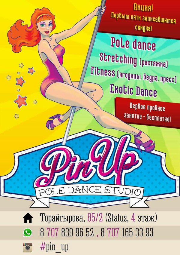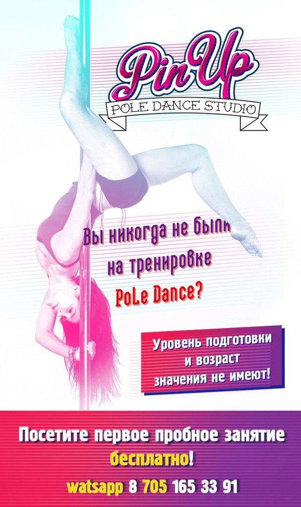 ВНИМАНИЕ, ДОРОГИЕ ДЕВУШКИ! Участвуйте в конкурсе! Pole dance студия PIN-UP проводит розыгрыш на БЕСПЛАТНЫЙ абонемент на месяц МАРТ! Условия розыгрыша: 1. Вступить в группу 2. Сделать репост этой записи у себя на стене Звони: WhatsApp) Наш адрес: ул. Ак. Бектурова, 35. 2 этаж, левое крыло Поверь в себя и все получится! Танцуй и летай вместе с нами! Итоги конкурса будут подведены 25 февраля.