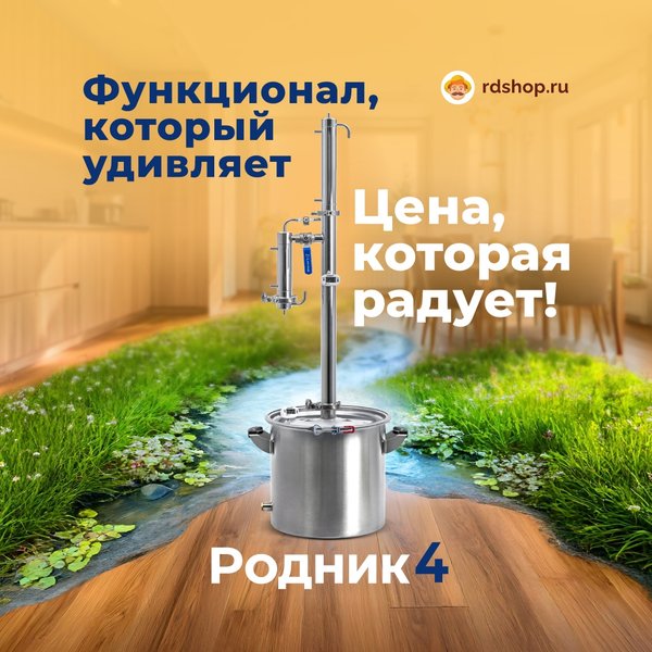 В продаже новый самогонный аппарат Родник 4! — Умный отбор по пару с технологией CleanFlow – всё просто, всё стабильно. — До 6 л/ч на первой перегонке — До 93° спирта в базовой комплектации — Куб на 20 или 37 л — 2 в 1: дистиллятор и ректификатор — Для новичков — максимум автоматизации — Для профи — полный контроль — Лучшее соотношение функционал / цена Смотри подробнее и заказывай: | rdshop.ru Задать вопрос менеджеру: