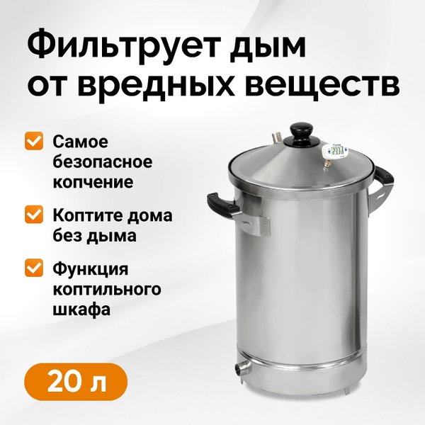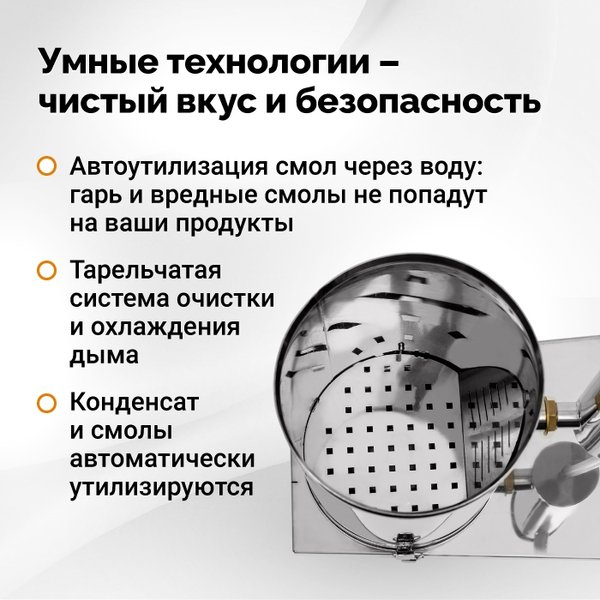 отает до 13 часов без остановки! Он сам очищает и охлаждает дым, удаляя вредные смолы. Безопасно, чисто, стабильно. Коптильный шкаф на 53 литра из пищевой нержавеющей стали. Легко моется и будет служить десятилетиями. Всё необходимое в наборе: щепа (уже почувствовали аромат яблони и ольхи?), шланги, крепежи, решетки и поддон. Что теперь будет на вашем столе? Аппетитная скумбрия с золотистой кожицей Нежнейшая домашняя буженина с глубинным ароматом дымка Копченые сыры для идеальной сырной тарелки Угорь, сало, куриные крылышки… Всё, что душа пожелает! Хватит смотреть на чужие фото! Пора, чтобы вашими копченостями восхищались ваши близкие и на вашем столе: