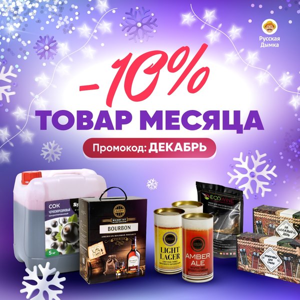 ТОВАРЫ МЕСЯЦА Пора готовить праздничный Новогодний стол? Мы вам в этом поможем. Дарим скидку -10% на следующие наборы: Для домашнего вина Для домашнего пива Для ароматных дистиллятов Для ароматных мацератов Для вкуснейших блюд ПРОМОКОД: ДЕКАБРЬ Подробности тут:
