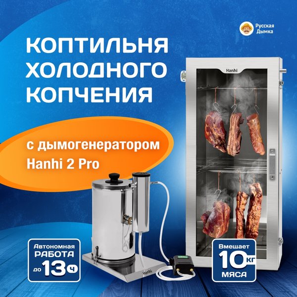 5°C), который является натуральным консервантом. Ваши продукты сохранят вкус и будут храниться неделями! Работает без вашего участия до 13 часов! Засыпали 5,8 литров щепы, установили и забыли. Не нужно подбрасывать щепу или следить за плотностью дыма. Идеально для ночного копчения. Защита и безопасность: Принцип гидрозатвора обеспечивает стабильную тягу, а защитная панель искрогасителя обезопасит вас от пожара. Конденсат и смолы автоматически сливаются в банку с водой. Сохраняет настоящий вкус: Корпус из пищевой нержавеющей стали AISI 430 не впитывает запахи и не влияет на вкус продуктов. Гарантия качества на 5 лет! Легко мыть: Полностью разборная конструкция без труднодоступных мест. Помыл и готов к новым кулинарным подвигам. Как начать коптить? Всего 4 шага: 1. Собрать дымогенератор и соединить с коптильней. 2. Опустить шланг в банку с водой (0,5 л). 3. Включить компрессор в розетку. 4. Заполнить бункер щепой, поджечь и установить искрогаситель. Всё! Дальше Hanhi 2 Pro работает сам. Вы занимаетесь своими делами, а в это время у вас готовится шедевр:
