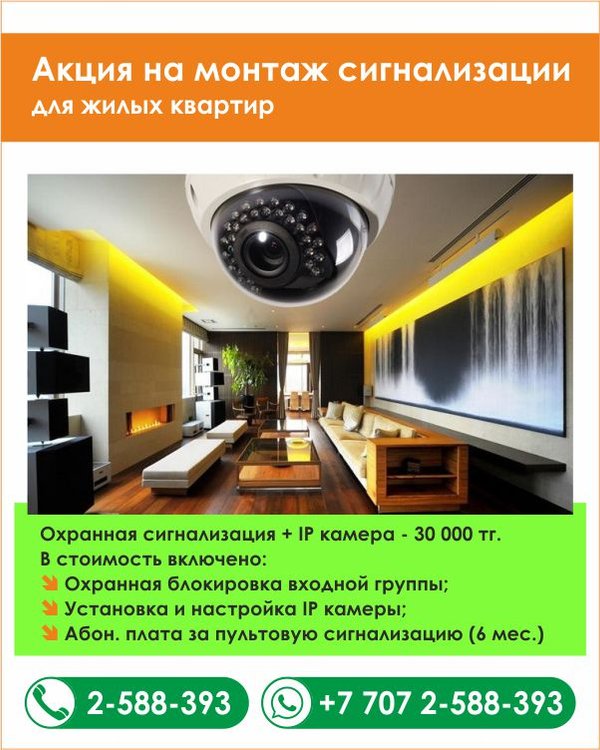 Стоимость установки сигнализации от 15 000 тг. В стоимость входит абонентская плата за 3 месяца Абонентская плата по истечению 3-х месяцев от 5 000 тг./мес. Размер ежемесячной платы зависит от количества датчиков.