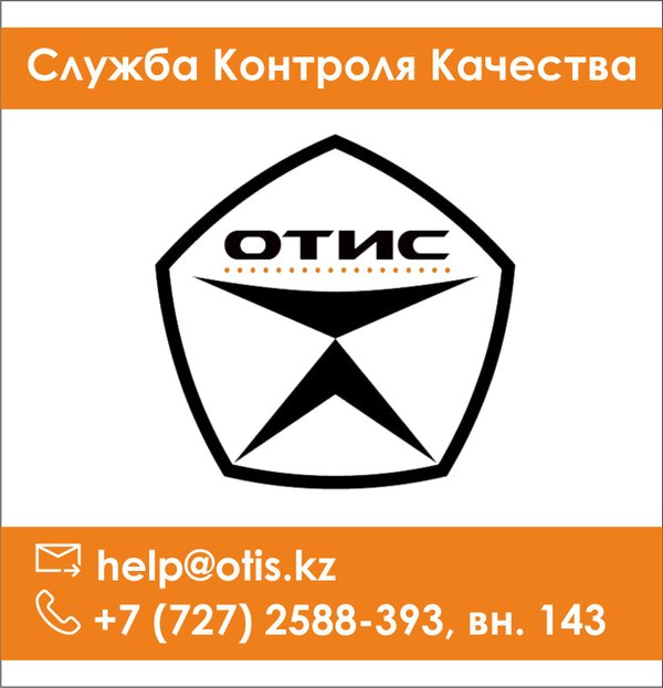 Служба контроля качества компании ОТИС – это шаг навстречу Клиентам компании, это взгляд на нас вашими глазами, это искреннее желание помочь и быть полезными нашим Клиентам. Мы хотим знать, что вы думаете о нас. Мы хотим лучше понимать, что еще мы можем сделать для вас. Мы хотим узнать, как улучшить наш сервис, чтобы вы были довольны и оставались с нами надолго. Мы хотим стать лучше вместе с вами. Давайте сделаем нашу работу лучше! Звоните нам по телефону:, вн. 143 Пишите нам на электронную почту: help@otis.kz