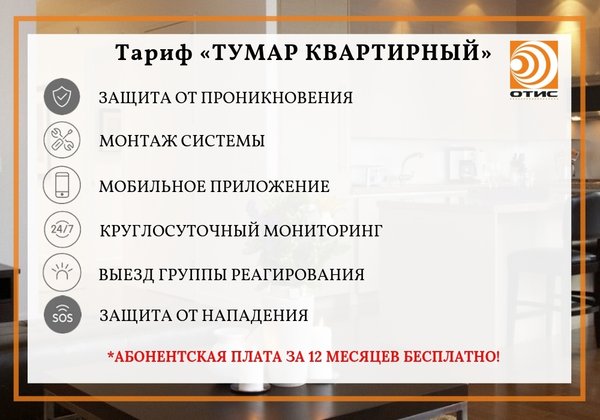 Хотите защитить свою квартиру? Компания ОТИС предоставляет пакет акций и тарифов для наших клиентов! Тариф «Выгодный» для безопасности Ваших квартир! Стоимость оборудования от 66000 тенге. Абонентская плата 5500 тг/ в месяц. *Полную информацию узнавать у менеджера! Наш телефон: Мы находимся по адресу: город Алматы, ул. Панфилова, 101 Наш сайт: Почта: sales@otis.kz