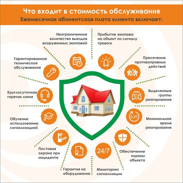Что такое стоимость обслуживания и что в нее входит Абонентская плата включает: Мониторинг сигнализации Минимальное время реагирования ▶ Экипажи прибывают на место по сигналу тревоги ▶ Пресекают противоправные действия ▶ Обеспечивают охрану объекта Неограниченное количество выездов вооруженных экипажей Постовая охрана при инциденте Выделенные группы реагирования Гарантия на оборудование Гарантированное техническое обслуживание Обучение использованию сигнализацией Круглосуточная горячая линия