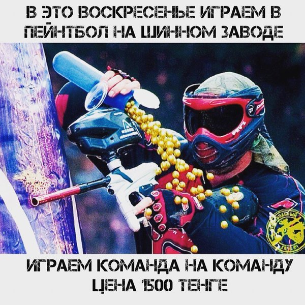 Дорогие друзья и Любители Пейнтбола.. Мы в это воскресенье едем на шинный завод что бы поиграть в пейнтбол команда на команду!!! Если есть желающие то могут присоединиться. Цена с человека 1500 тенге. Наши контакты:,. Батыр