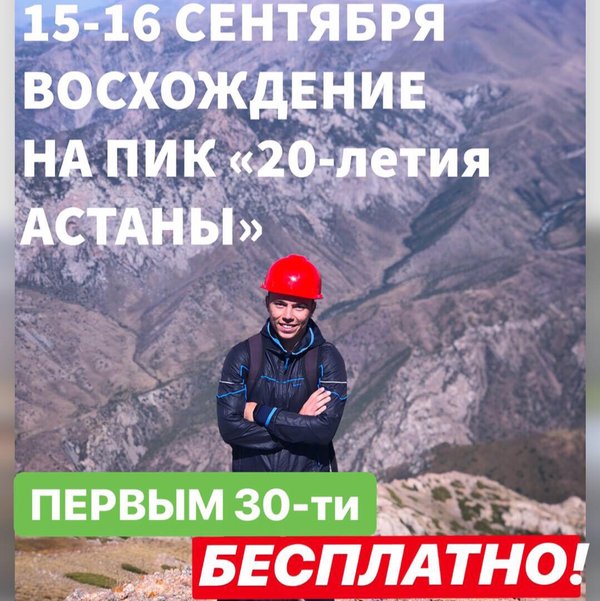 осхождения пика «20-летия Астаны». Для тех кто уедет 15 вечером будет транспорт. . . С собой как всегда: — ветровка — головной убор — одеяло — удобная обувь — вода и перекус — кто остается на 2 день, палатки, спальник, теплое одеяло, шапка. . . 15 сентября встречаемся кому удобно на Махараджа в 9:00, кто из нашего зала желательно в зале на 11 мкр, ул. Елшибек Батыра 110A также в 9:00. . . Лучше гор могут, быть только горы! . . Организаторы: @kazakhtourism_official @ontustik.alpinism . . Контакты: ;