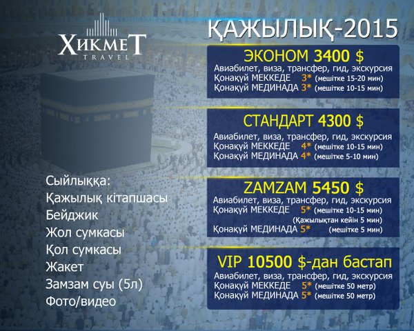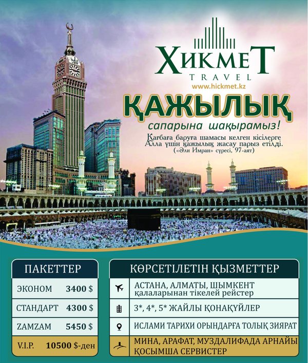 «Хикмет Travel» қажылық компаниясы қазақстандық қажыларымызға арнап қазақы ою-өрнектермен зерленген арнайы ИХРАМ киімін әзірлетті. Сіз қасиетті Мекке қаласында құлшылығыңызды өтеп жүріп ихрамыңызға ойыла салынған қазақы ою-өрнектер арқылы қазақ елінен екендігіңізді айғақтап жүресіз. Сондай-ақ, күннің ыстық сәттерінде де таза мақтадан әзірленген ИХРАМ сізді ыстықтан қорғанып, салқын жүруіңізге де қолайлылық тудырады. Аллаһ тағала қажылықтарыңызды әрі шынайы ниет-ықыластарыңызды қабыл етсін!