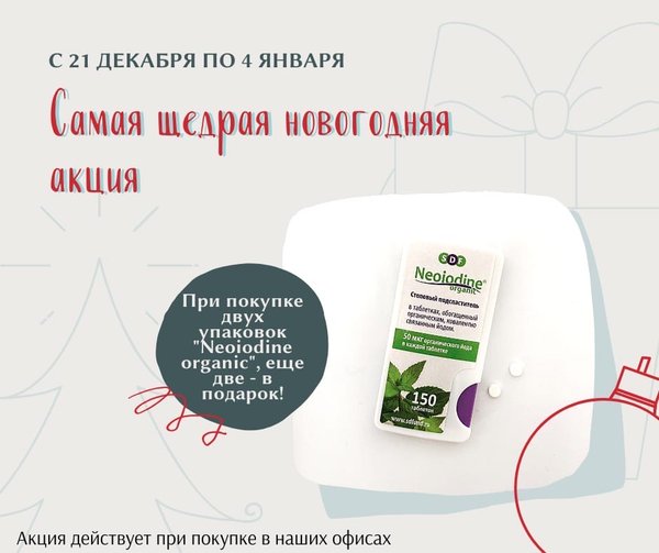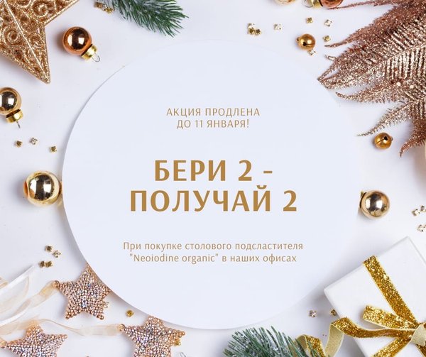 В преддверии нового года мы решили провести акцию С 21 декабря по 4 января при покупке в наших офисов двух столовых подсластителей «Neoiodine organic”, ещё два Вы получаете в подарок!
