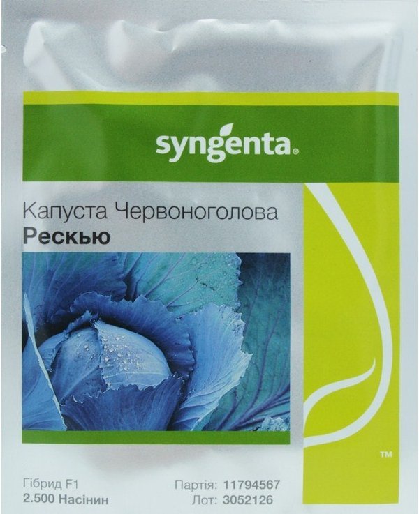 Семена краснокочанной капусты. Гибрид Рескью F1. Вегетационный период — 135—140 дней. Вес кочена — 2—2,5 кг. Устойчивость к фузариоз, трипс. Хранение — до 8 месяцев.
