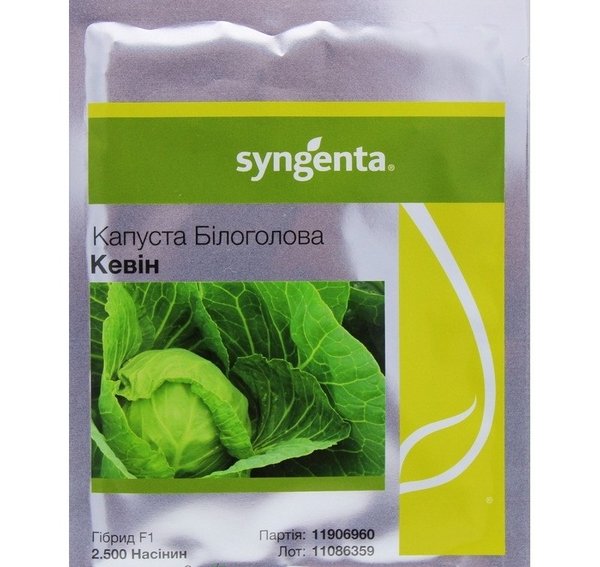 Семена белокочанной капусты. Гибрид Кевин F1. Вегетационный период — 48 -52 дней. Вес кочена - 1,2—2,0 кг. Густота посадки 55—60 тыс./га. Устойчивость к фузариоз.