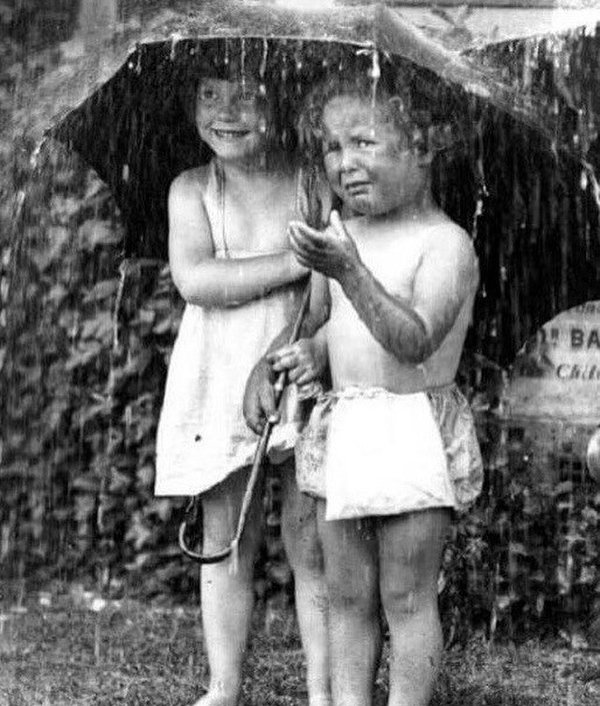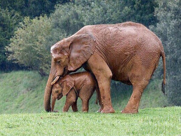 Мама прячет малыша от дождя