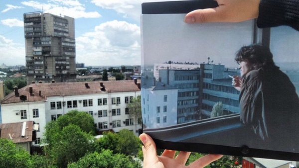 Новая жизнь кадров легендарного фильма в фотопроекте По следам Цоя в Алма-Ате. Кадры взяты из фильма Игла 1988 года.