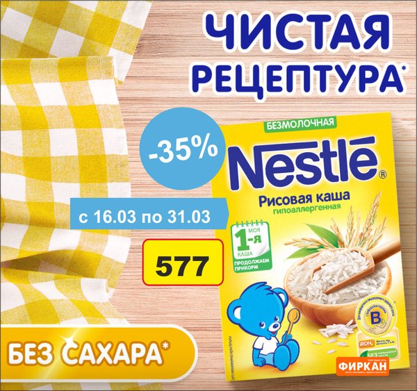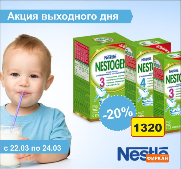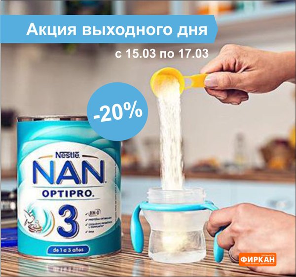 Акция выходного дня! Только до 17 марта (включительно) Нестле детское Nan 3 junior 400 гр с 12 мес Нестле детское Nan 4 junior 400 гр с 18 мес Акция действует по всех магазинах «Фиркан»