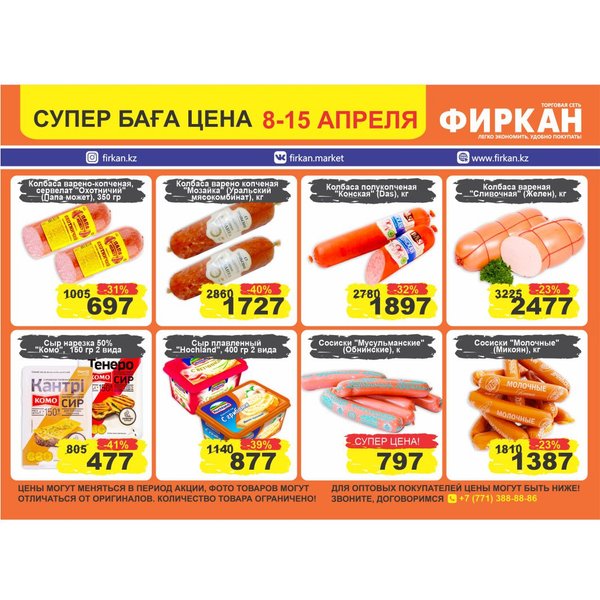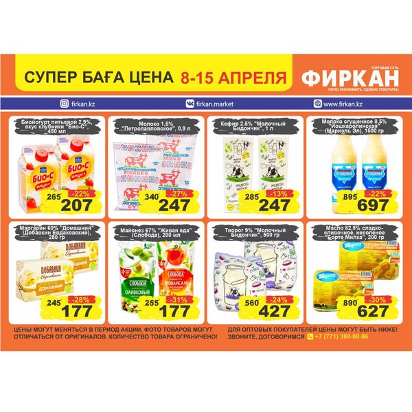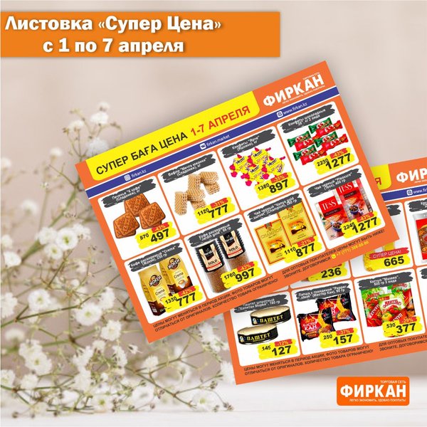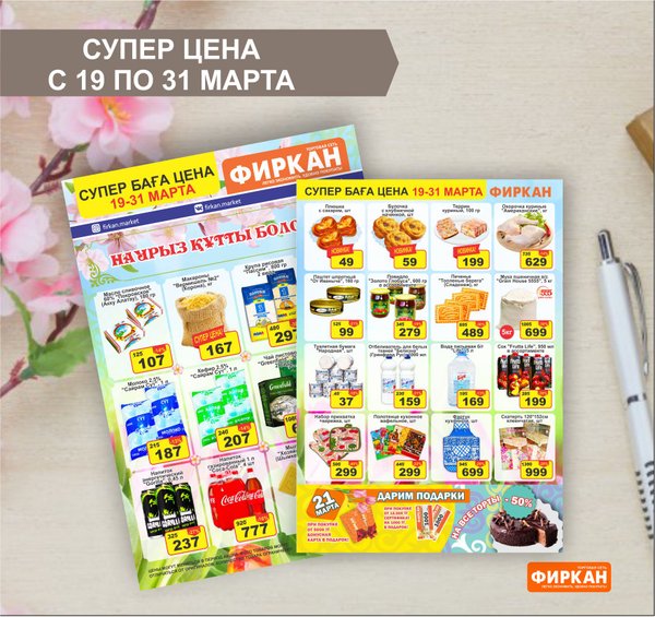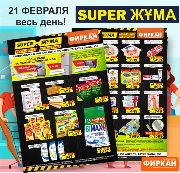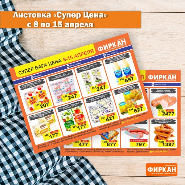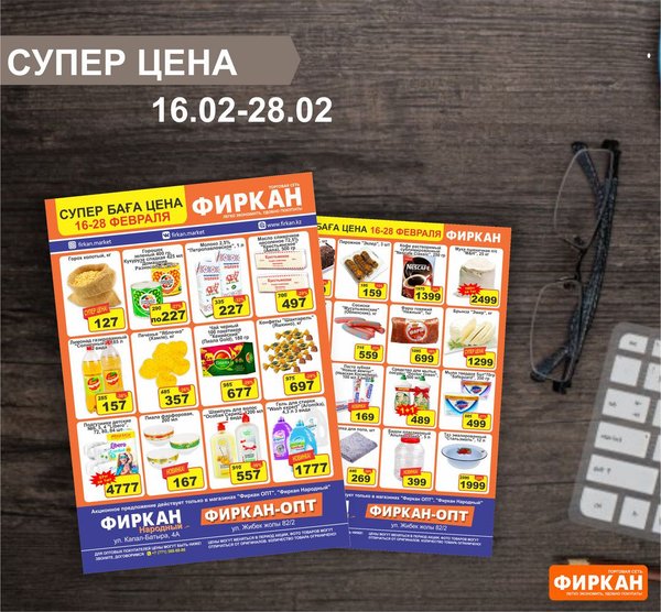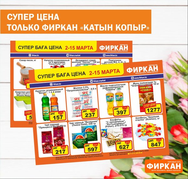 Листовка «Супер Цена» с 10 марта по 10 апреля Акционное предложение действует только в супермаркетах: Фиркан Сити,пр.Тауке Хана 330/1 Фиркан Плаза,пл.Аль-Фараби 3/1 Фиркан Гипер Хаус, ул.Дулати 202 Фиркан Народный, ул.Капал-Батыра 4А Фиркан Катын копыр, Тамерлановское шоссе 22/5 Фиркан Пахтакор,ул.Жибек жолы 82/2 Фиркан Тельман,ул.Молодая Гвардия ст.41В Фиркан Север, мкр.Терискей 18/1 Фиркан Мега,пр.Тауке хана 13 Желаем приятных покупок