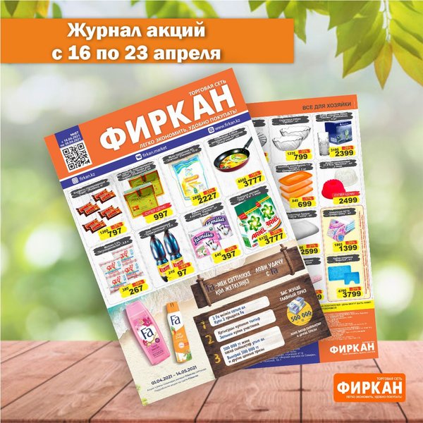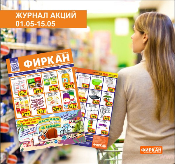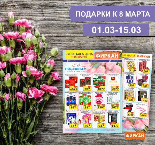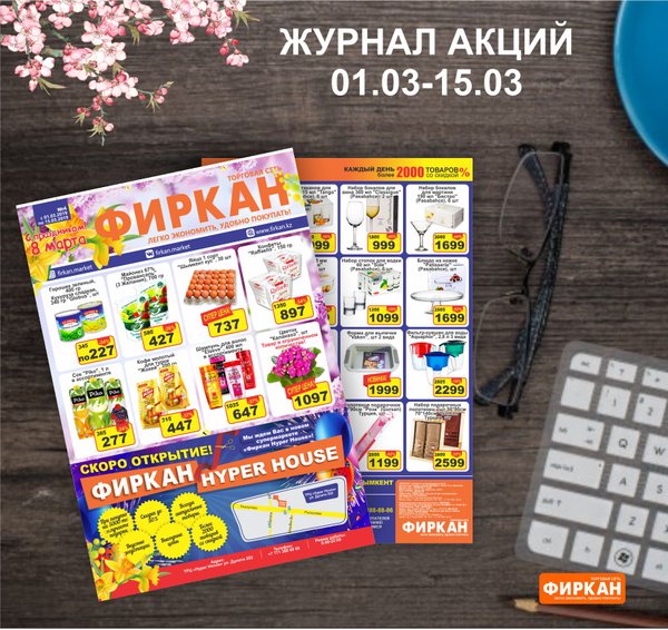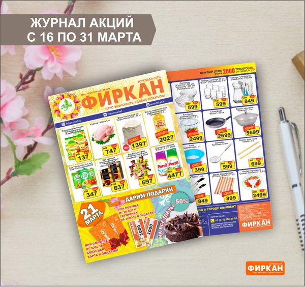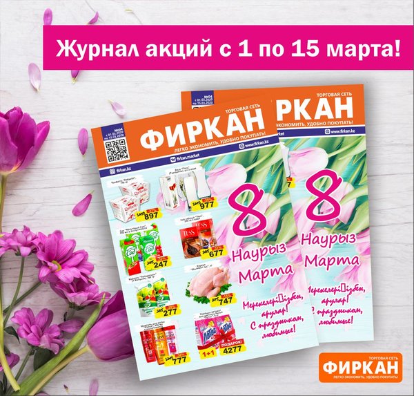 Журнал акций с 16 по 31 марта. А так же, только 21 марта! Акция во всей сети «Фиркан» -при покупке от 5000 тенге вы получаете в подарок дисконтную карту! -при покупке от 15 000 тенге вы получаете сертификат на 1000 тенге! *количество карт и сертификатов ограничено желаем приятных покупок!