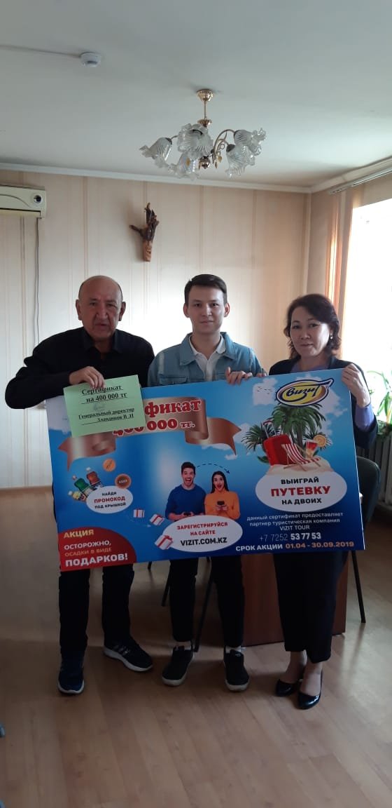 Генеральный директором ТОО «ЗБН ВИЗиТ» Злавдинов Вельким Ильич вручает супер приз сертификат на 400 000 тыс второму победителю акции «Осадки в виде подарков»