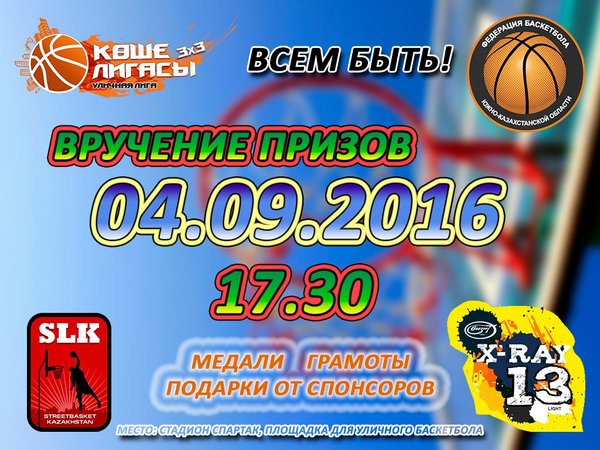 Уважаемые участники, завтра — «4» сентября 2016 года состоится вручение призов победителям «УличнойЛиги3×3», г.Шымкент. Всем быть на площадке на Стадионе «Спартак» в 17.30. Удачного всем дня и хорошего настроения! Спасибо нашему спонсору за помощь в проведении мероприятия ЗБН «Визит» с торговой маркой «X-Ray», а также Рекламному агентству «Pro100Реклама».