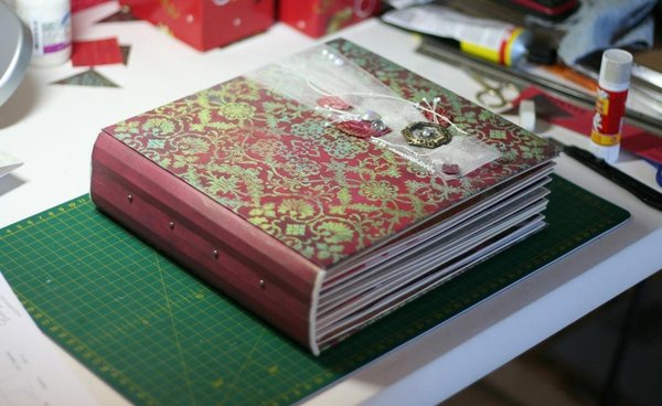 ередине отмеряем расстояние 4 мм и проводим острым предметом по краям, чтобы сгибать удобно было (я использую непишущую ручку). Расстояние 4 мм вполне хватает для страниц с объемными украшениями — розочками выпуклыми и т.д., если объемных украшений нет, то можно и поменьше делать зазор — 3 или 2 мм. По краям срезаем углы под 45 градусов. Сгибаем полосочки по сгибам и приклеиваем к страницам. Обязательно проверяйте, чтобы последующая страница приклеивалась ровно, чтобы весь альбом не перекосило. Вот такая красота должна была у вас получиться. Ну, а это поближе. Теперь берем марлю или бинт, и проклеиваем корешок. Не забудьте оставить 1,5 см по краям. Берем тесьму, которой обычно края обрабатывают, и отрезаем два кусочка по ширине нашего переплета — в моем случае 7,5 см (ужас какой!!!). Подрезаем лишнюю марлю и приклеиваем кусок тесьмы с одной и другой стороны. Смысл в этой тесьме такой: 1. Чисто эстетический — закрывает торец перплета, и благодаря ему невидно, если что-то не ровно приклеено. 2. Практический — еще раз крепко скрепляет листы по краю, чтобы не отрывались. Теперь клеим корешок. В моем случае он состоин из двух частей, т.к. бумага очень тонкая, но если поплотнее, то можно и одним слоем обойтись. Я вырезала две детали, внешняя — по ширине и длине корешка, плюс по 1,5 см с каждой стороны, вторая — точно по ширине и длине корешка - т.е. 25*7,5 см. Вклеила внутреннюю часть на внешнюю и загнула верхние и нижние концы внутрь. Еще деталь — опять же острым предметом провела поперечные линии по вертикали с интервалом в 1 см, чтобы корешок имел плавный изгиб. Прикладываем (НЕ ПРИКЛЕИВАЕМ!) наш корешок к переплету. И приклеиваем обложку. Сверху и снизу. Обложку приклеиваем к внешней стороне загибов корешка. Теперь открываем обложку и приклеиваем к ней изнутри торчащий край марли и свободную сторону нашей соединительной полоски, которыми мы скрепляли листы. Скажу честно, клеила на Момент, не на обыкновенный, а на прозрачный. Больше всего мне нравится, что он быстро сохнет и излишки клея стираются резинкой. Обратите внимание, сам корешок К ТОРЦУ переплета ПРИКЛЕИВАТЬ НЕЛЬЗЯ!!!, в противном случае страницы у вас открываться не будут. На фото видно, что корешок отходит от торца переплета. В этом еще один плюс тесьмы, которую мы приклеели — она закрывает дырку между торцом переплета и корешком. Ну, вот, теперь можно и страницы приклеивать. Поскольку у меня случай тяжелый — 12 листов, то я прихватила корешок посередине брадс, т.к. он очень сильно отходил, когда альбом открывали — широкий очень… Источник: #мастер_класс@scrapidea #альбомы@scrapidea